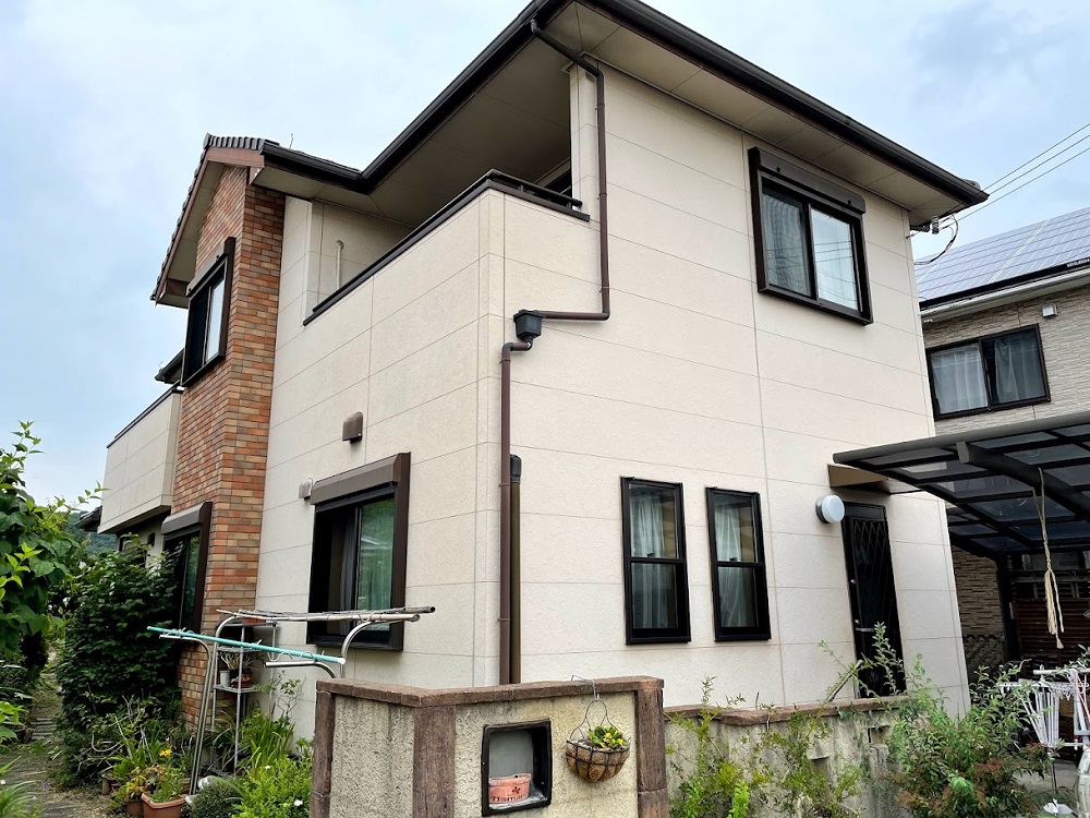 外壁の面積も大きく、経年劣化によるサイディングボードの割れも生じていた為、下塗りに入る前にクラック補修を施しました。目立つ箇所のクラック(ひび割れ)から、見つけにくい箇所まで、どこにいくつのクラックがあるか探す作業も苦労のひとつでした。補修できたクラックにはグランコートベース「水性エポキシ」を使えばしっかり密着・再生・防水されるので、大切な工程です。