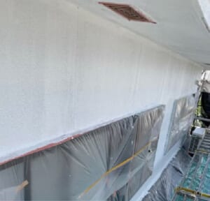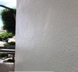 築年数が経過しており、外壁には経年劣化から来る剥離や亀裂が数か所見られました。このまま塗装を行うと美観や耐久性に影響があるため、凹凸パターンを同じにするために吹き戻しをしてから外壁下塗りを行いました。