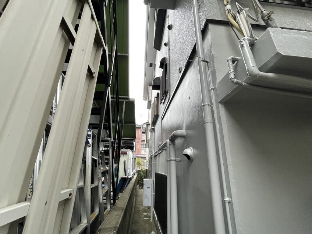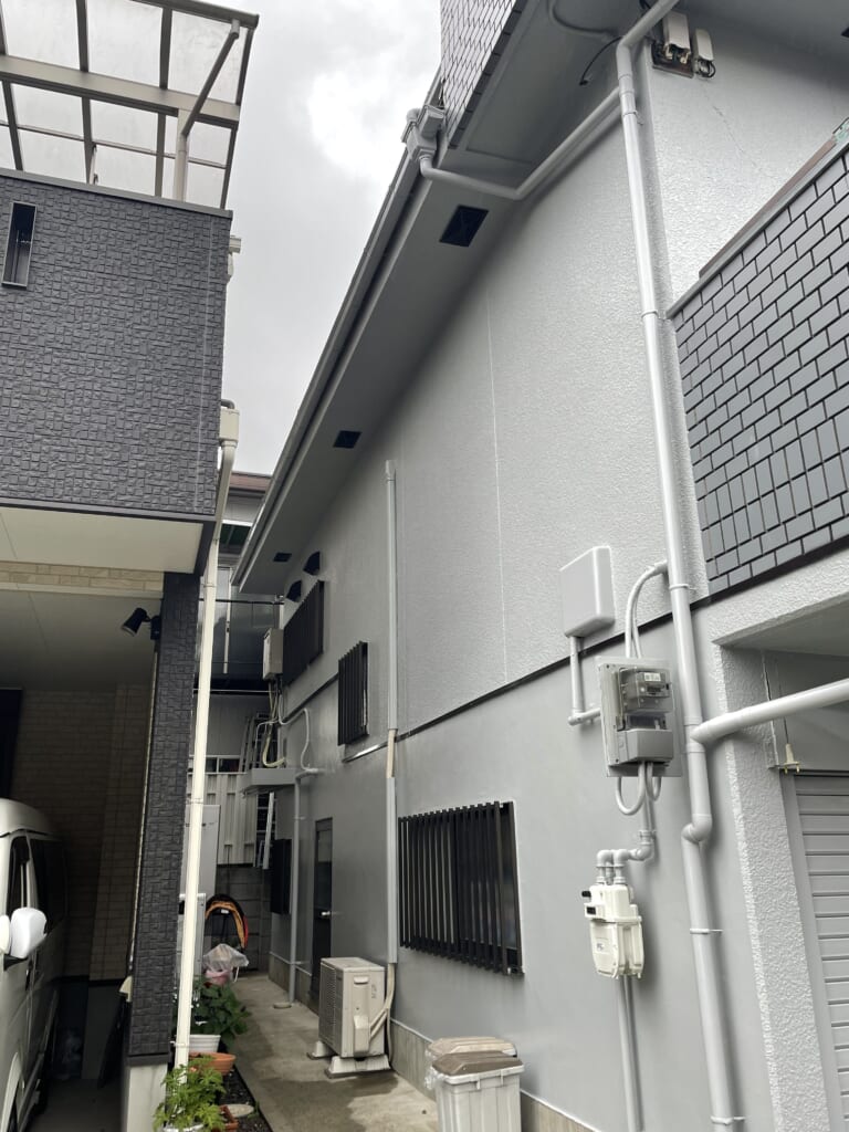 お住まいを確認したところ、チョーキング(外壁を触ると白い粉が付着する現象。)が目立つ外壁でした。丁寧に高圧洗浄をした後に、水性クラフトという下塗り材を塗布致しました。外壁塗装をする上で外壁下塗り作業は外壁と塗料を密着させるために重要な役割を果たしています。そのため、下塗りからムラなどがないように丁寧に仕上げました。