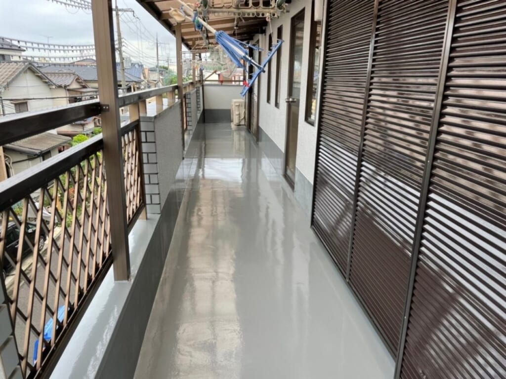 ベランダ部分は雨風や紫外線の影響をもろに受ける為、ベランダの防水性が完全に無くなってしまう前に、定期的なメンテナンスは必要です。今回は、ベランダが少し色褪せて白くなり、メンテナンスの時期に来ていたので、防水工事を行いました。トップコートをムラなく塗り、防水性を維持できるようになりました。