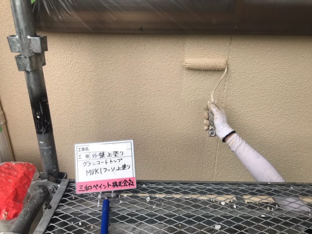 旧塗膜がリシンというピンホールが発生しやすい外壁でしたので、下塗りでしっかりピンホールを消す事を意識して作業を行いました。(ピンホールは、塗装面に生じる小穴の事です。)そのおかげで、外壁中塗り・上塗りもスムーズに塗装することができました。