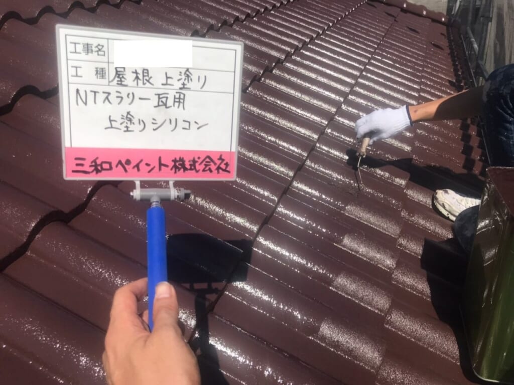 モニエル瓦(セメントベースの屋根)の塗装という事で、念入りに高圧洗浄を行いました。下塗りのNTスラリー瓦用強化剤から、上塗りのNTスラリー瓦用上塗りシリコンまで、各工程、隅々までハケとローラーにて塗装作業を行いました。