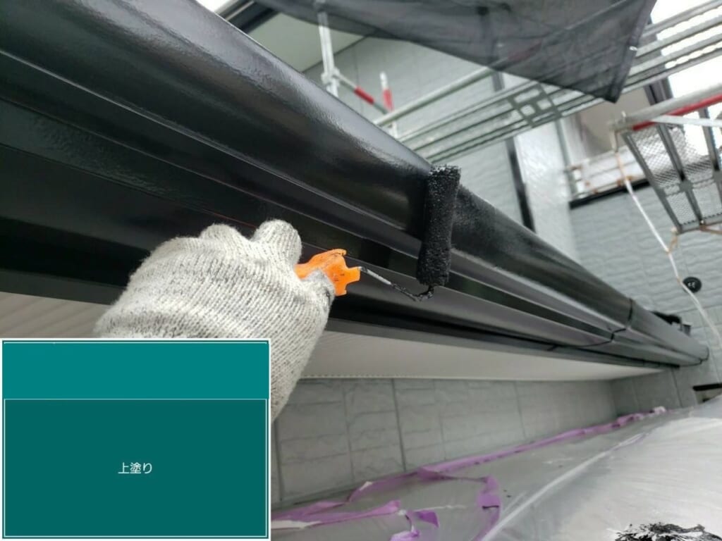 付帯塗装は外壁の色と異なり黒っぽい色だったため、雨樋などの付帯部分はお住まい全体が引き締まって見えるように細部までこだわって塗布していきました。付帯部分にムラが出来てしまうとお住まい全体の印象が悪くなってしまうので慎重に作業を進めて行きました。