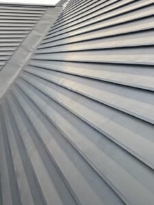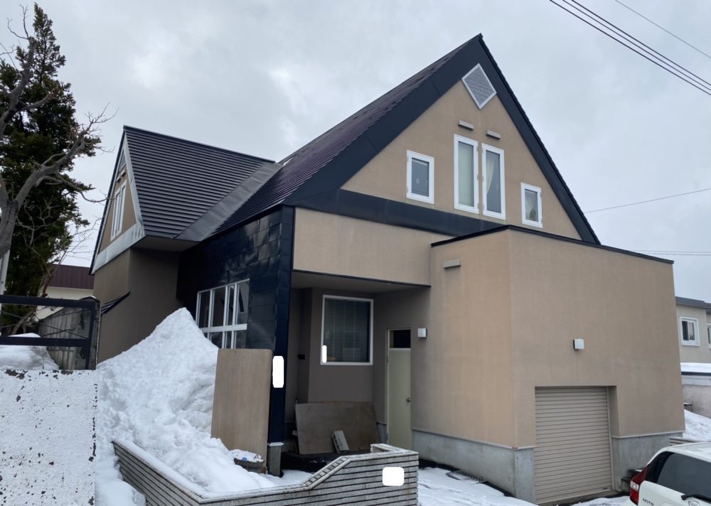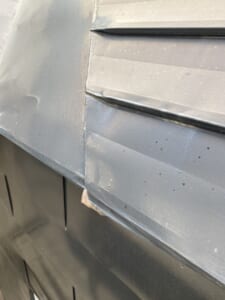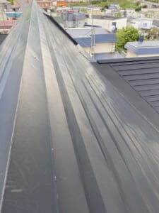 急勾配の三角屋根ですが、年々雪の落ちが悪くなっている、とお客様からお悩みの声がありました。前回塗装が剥がれ、屋根の折り返し部分に錆が出ていたので、ケレン作業を念入りに行いました。フッソ塗料を重ね塗りした屋根は鏡面のような光沢で、住宅を雨雪から長く守ってくれます。
