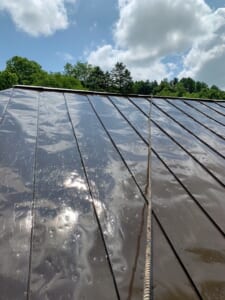 屋根全体の色を変える事で、お住まいの雰囲気がガラッと変わります。今回、こちらのお住まい様は三角屋根ですので、赤系の色から茶系の色に変更し、イメージチェンジいたしました。今までと色が変わるということで、お客様からもワクワク感が伝わってきて、こちらとしてもご期待に応えるべく、上塗り塗装に力を入れて対応しました。特に、ローラーのムラがないようにと意識しながら対応致しました。
