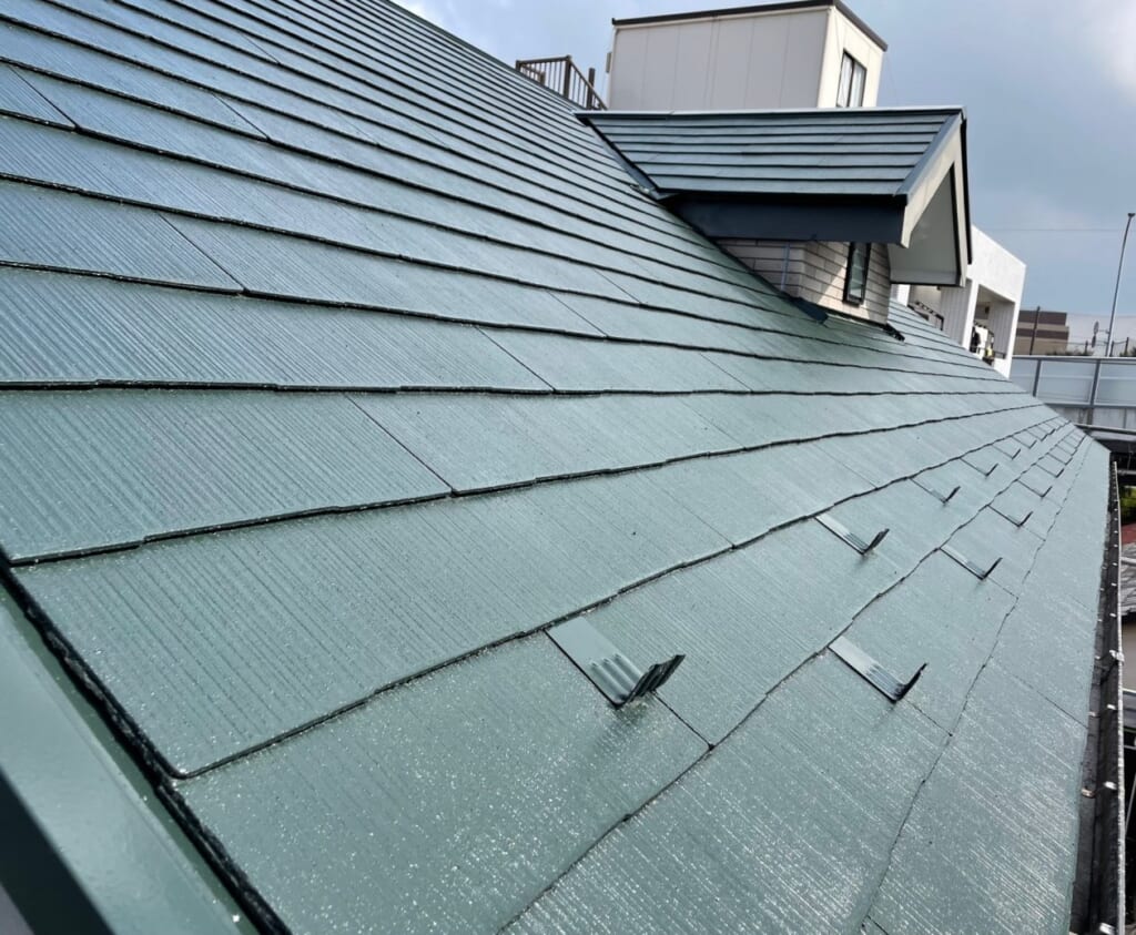 屋根に関しては今回特に気にされているとの事でしたので、高耐久なフッソ塗料をおすすめさせて頂きました。色に関しては事前打合せの段階でサンプルから選んで頂いたネオモスグリーンを使用し、仕上がりもすごく綺麗になりました。