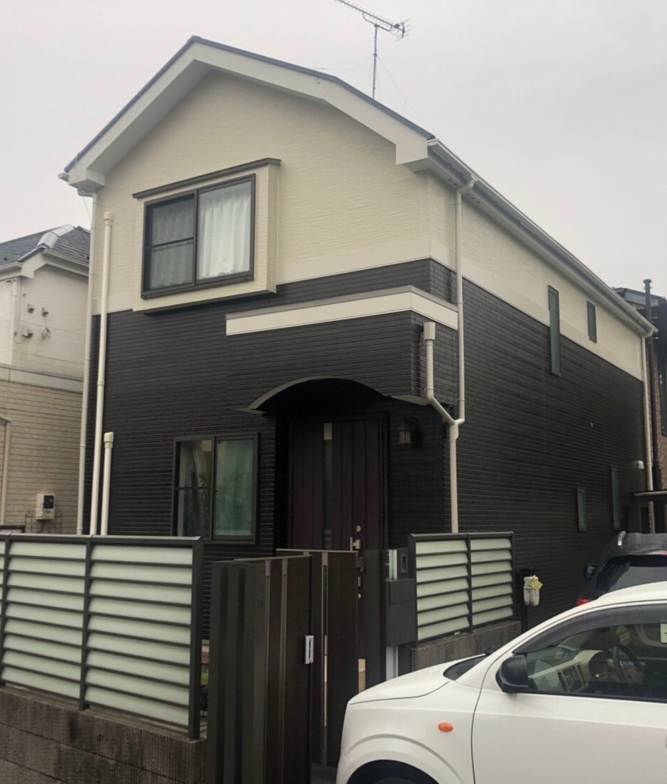 東京都稲城市、メーカー様でお建てになられたお住まいです。通りに面した角の目立つ立地のお住まい様です。経年劣化に伴う色あせやひび割れを気にされていました。施主様と何度か打ち合わせをさせていただき1階と2階で2色分けにし、見た目の印象を変えました。メリハリがつきとてもきれいに仕上がりました。外壁はラジカル系、屋根はシリコン系の塗料を使用いたしました。