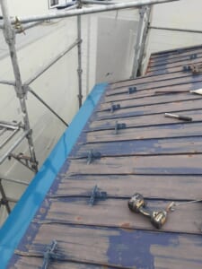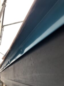 軒先の板金は、一部サビが進んで小さな穴が開いている部分があったため、塗装前に部分的な板金の張替えが必要でした。現状の屋根の形状を変えないよう、また、塗装後の仕上がりを綺麗にするため屋根の塗料と同色に近い色の板金で張替え工事を行いました。