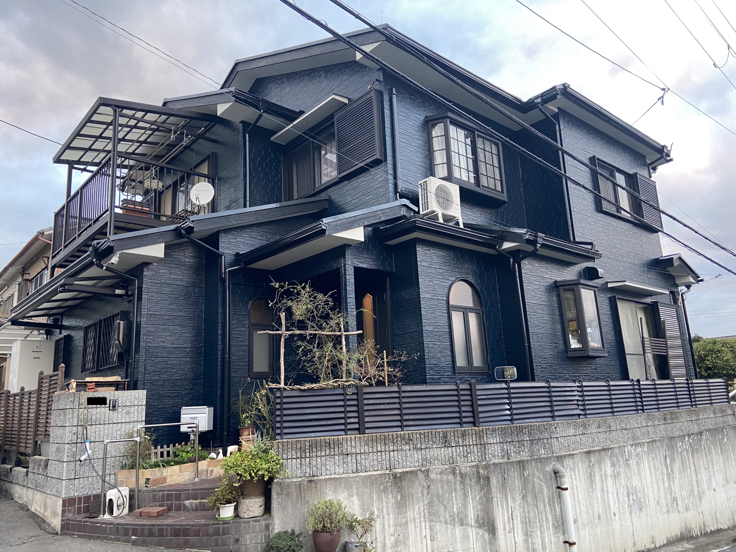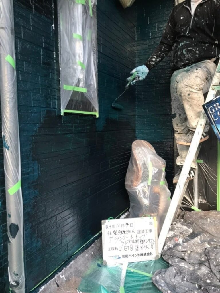 今回選ばれた外壁の色が塗装するには難しい色味でした。仕上げの色が止まりにくく2回塗布するところ、3回塗布しました。色ムラや塗りムラがあるとかなり目立ってしまう色味だったので、何度も確認しながら、仕上がりを意識し塗布していきました。