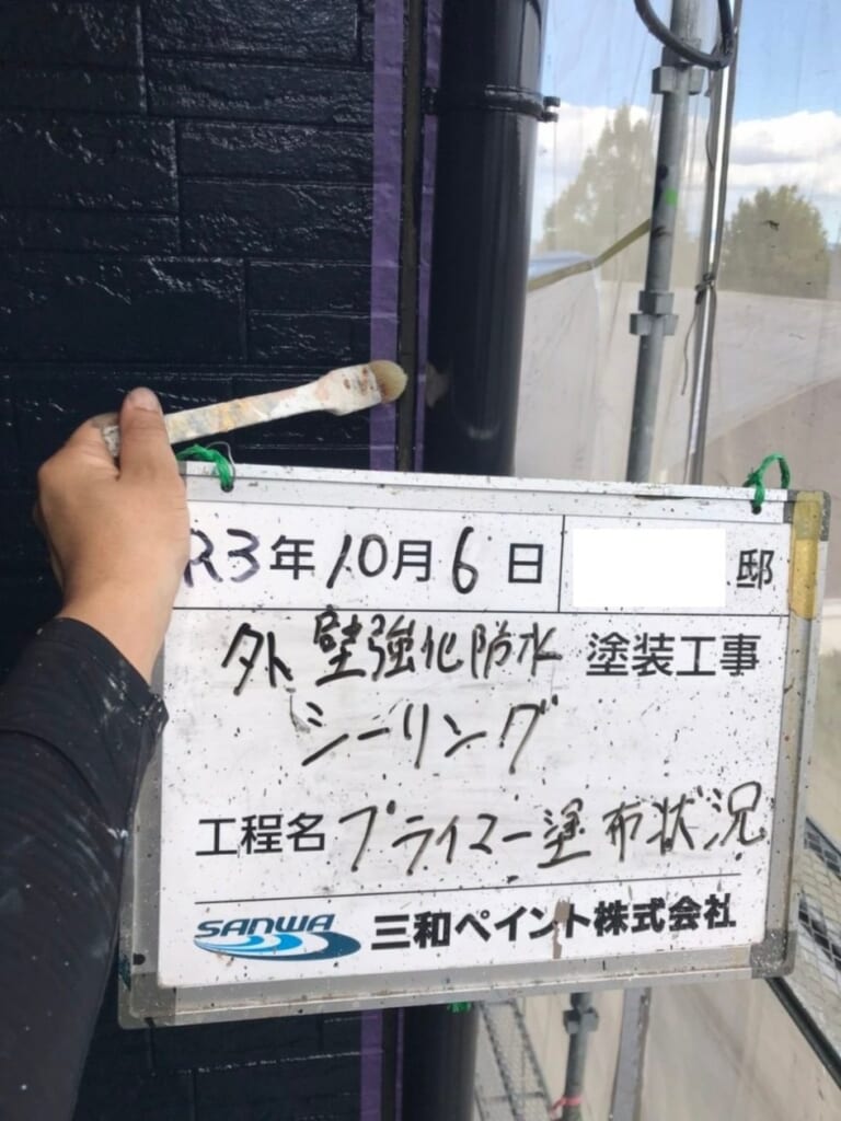 サイディングのジョイント部分(サイディングのつなぎ目)の隙間がが気になると施主様に言われる事が今までも多くあった為、今回のお住まいも、下地の時にジョイント部分を先に埋めてから、塗装を行っていきました。