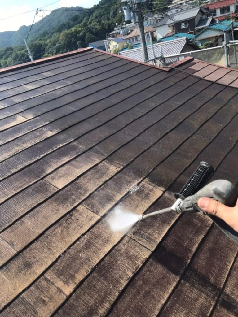 屋根の汚れやコケが多く見られました。塗装作業に入る前に、高圧洗浄で汚れやコケを隅々まで綺麗に洗い流しました。高圧洗浄を丁寧に行えば、仕上がりも大きく変わる為、屋根の洗浄~仕上げまで、入念に作業を行いました。