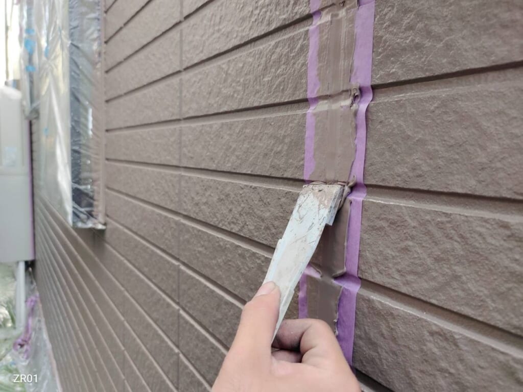 コーキング部分をチェックしたところ、経年劣化により亀裂が出ている部分もありました。劣化したシーリングを綺麗に剥がし、シーリングが密着するようにプライマーをしっかりと塗りました。綺麗に塗装した外壁にシーリングがはみ出さないよう、また表面の統一感を作る為に、仕上げにハケを使いライン出しをしました。