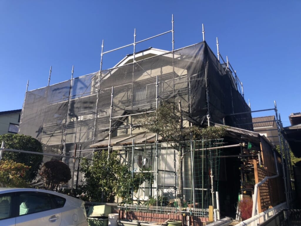 今回のお住まいは外壁に沿うような形でご主人様お手製の風除室がありその屋根のポリカを外して足場をかけるか、そのまま上にのせてかけるかを直前まで試行錯誤しました。風除室の屋根や骨組みがしっかりしていたこともあり今回はポリカの上に乗せる形で足場を組ませていただきました。