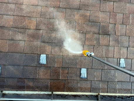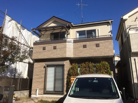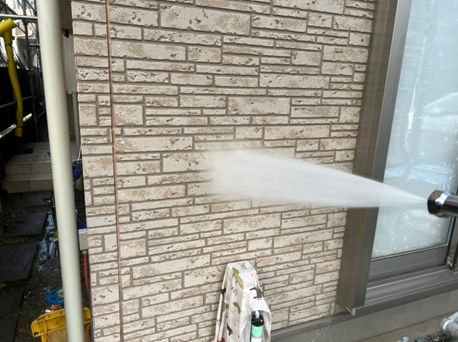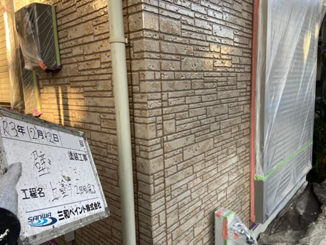 壁には空気中の細かい埃や、コケ等沢山の汚れが付いています。洗浄作業を疎かにしてしまうと塗料の密着が悪くなり、すぐに剝がれたり色ムラの原因にもなります。今回のお住まいは1階部分がレンガ柄、2階部分が細かな凹凸のあるサイディング外壁だったので、入念に洗浄をし、塗装前の準備をしっかりと行いました。