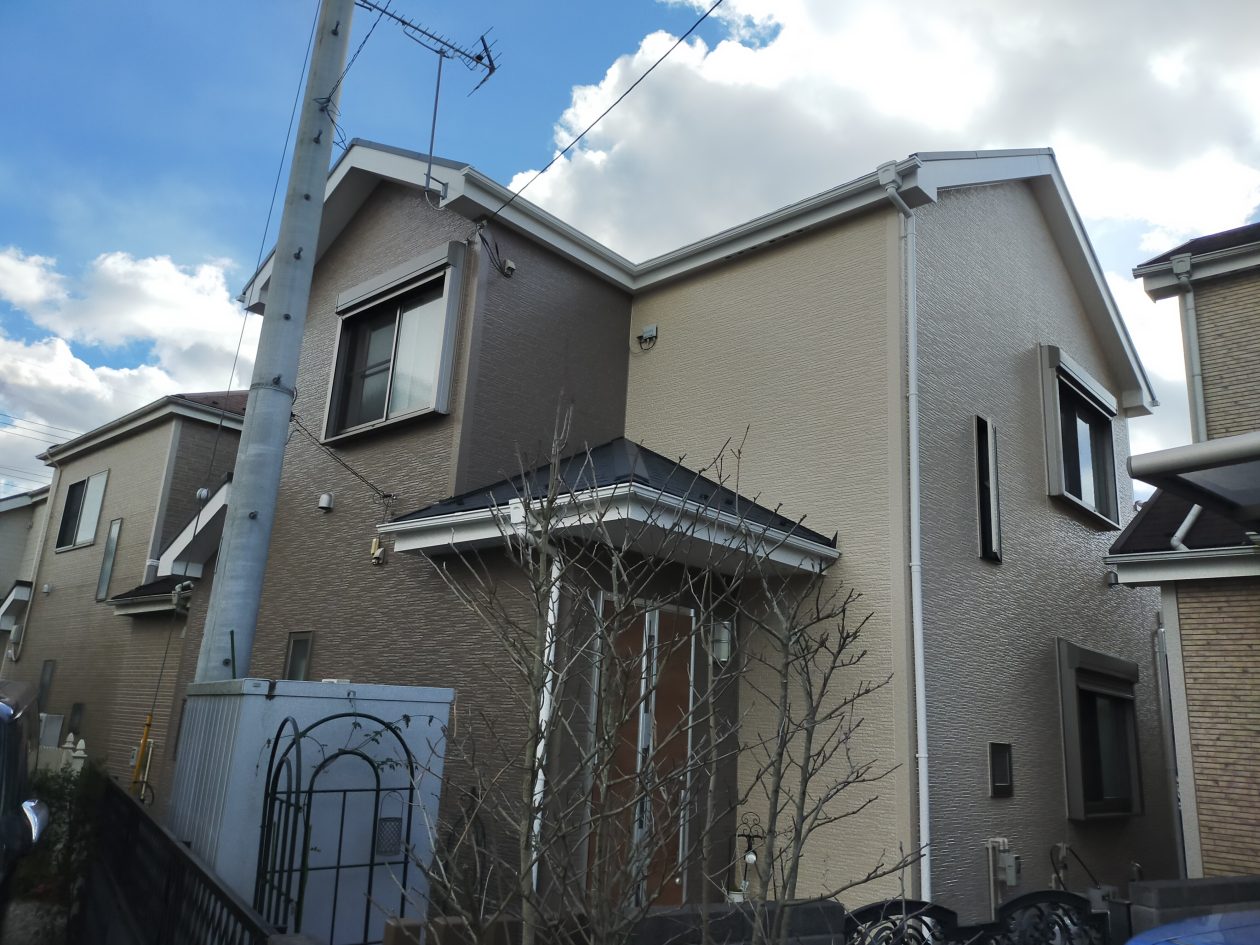 今回は築10年以上経過しているお住まいの初めての塗装工事でしたので、外壁の細かな傷みが出ている状態でした。塗装の上塗りの密着力を高める為に、下塗りの工程が大事になってきます。下塗り塗装工程が抜け漏れがないように点検を行いました。