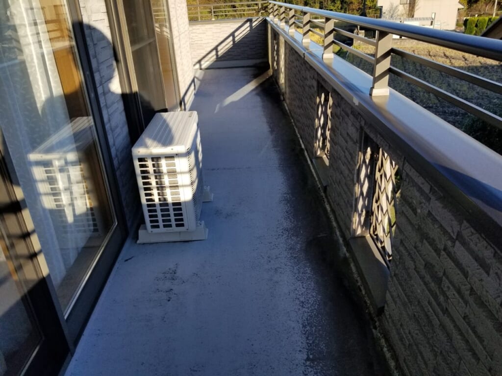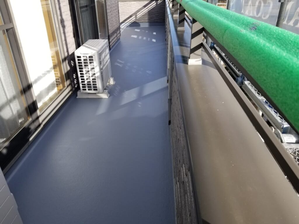 お住まいの南側にあるベランダは紫外線による劣化が進みやすい箇所です。今回はベランダ表面が剥離してきたので、表面の密着が弱い箇所はケレン作業で削りました。その上に防水能力を高める塗装を行いました。