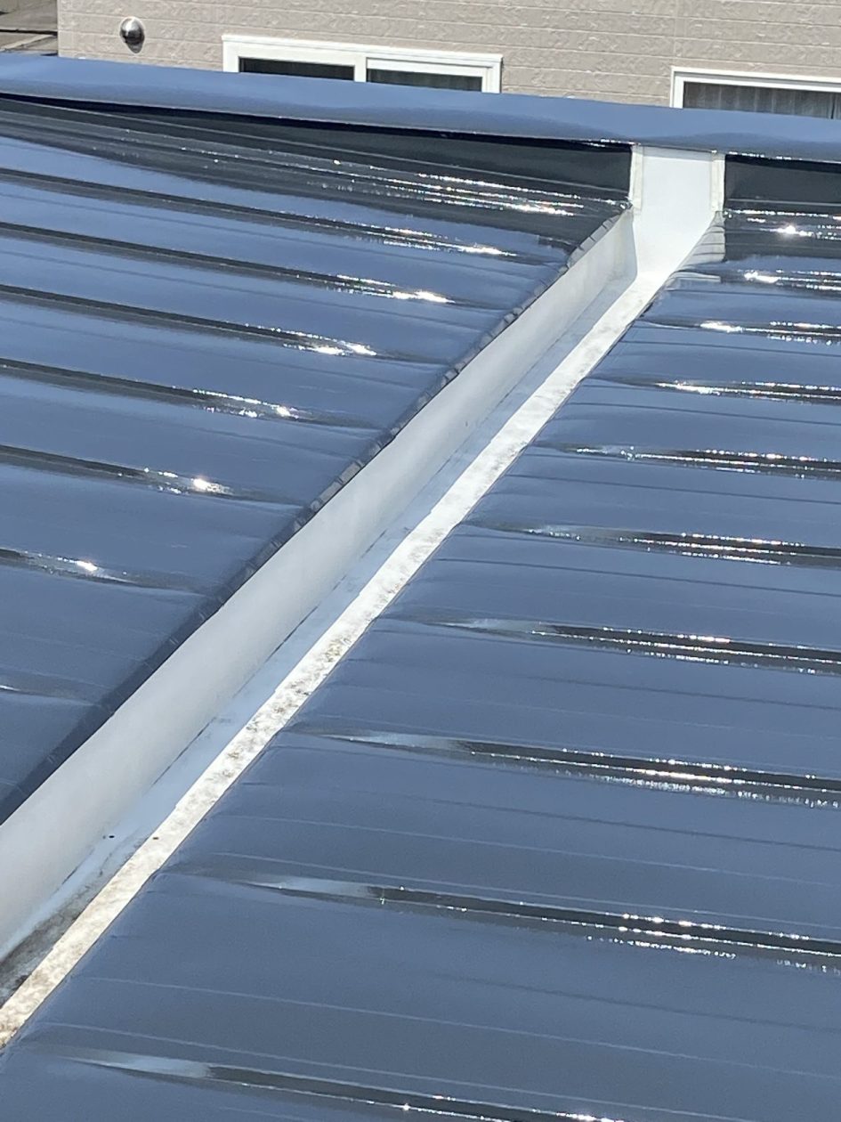 洗浄後しっかりケレン作業を行い屋根ダクトのコーキングも切れている所が何か所か有ったのでコーキング補修後錆止めをむらなく塗り、特にハゼの継ぎ目は入念に行うように職人に徹底させました。また唐草部分も丁寧にやるよう指示しました。