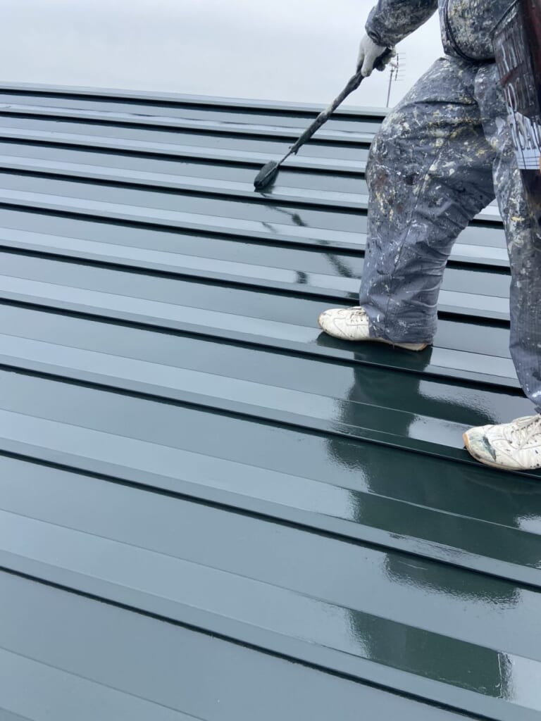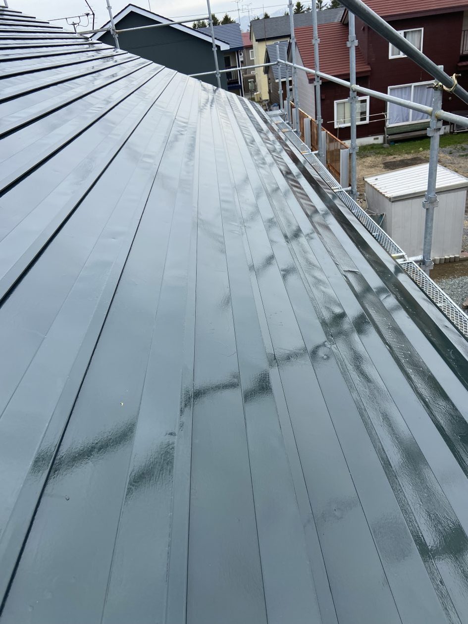 中塗り同様上塗りも屋根の傾斜に気を付けて、天気のいい日にしっかりとした塗装を行うことでいい仕上がりになり光沢も増しました。完工後は施主様に足場に登って見ていただいてやっぱりプロの仕事は違うね!とお褒めのお言葉をもらいました。