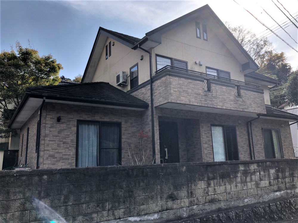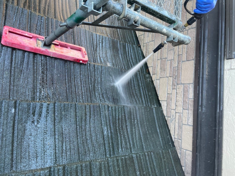長年のコケや塵・埃を落とすことで、その後の塗料の密着度を高めます。かなり凹凸のある特殊な屋根材でしたので、特に時間をかけてしっかりと高圧洗浄を行いました。