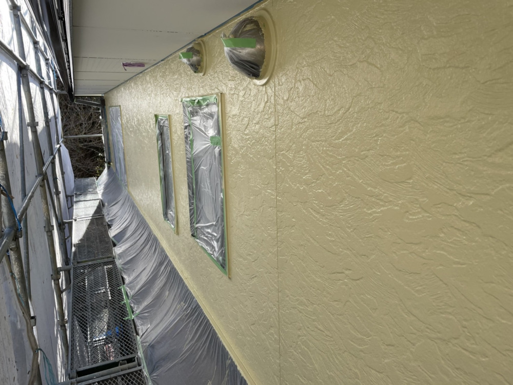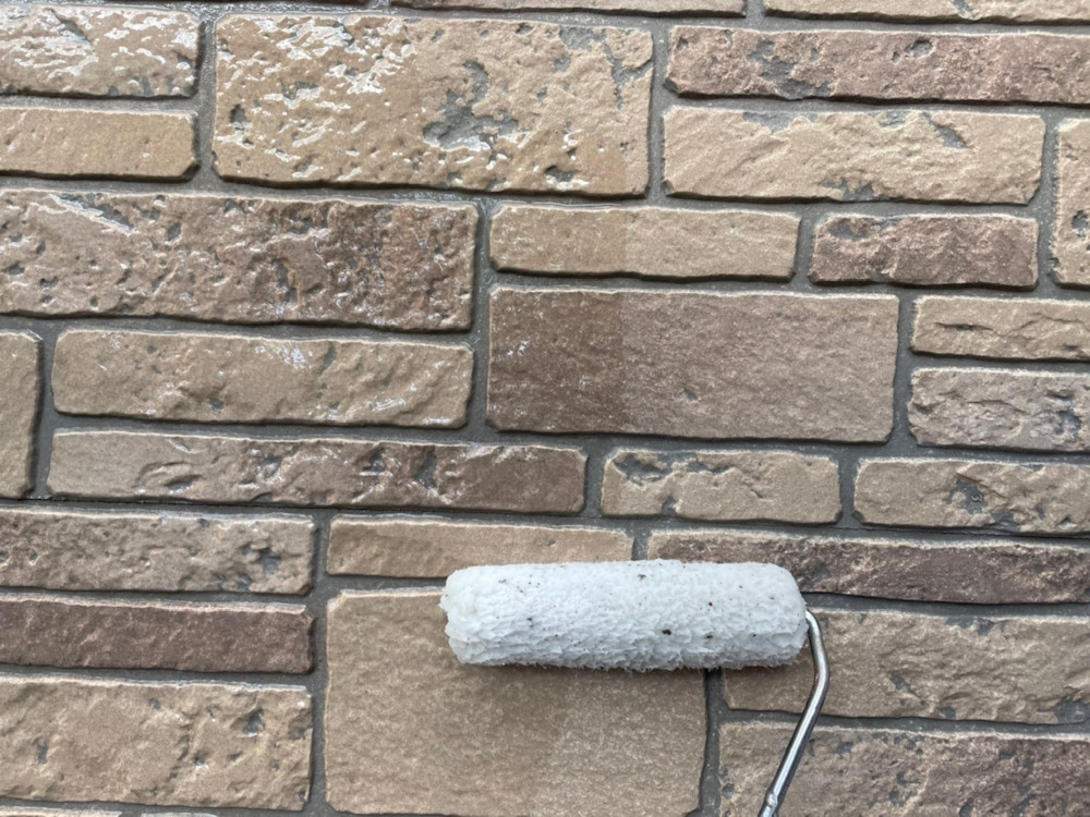 外壁の上塗り工程です。透明な塗料なので、塗り忘れがでないように面や階で、都度確認を取りながら丁寧に作業させていただきました。膜厚にも注意しムラがでないように仕上げました。