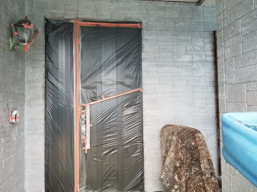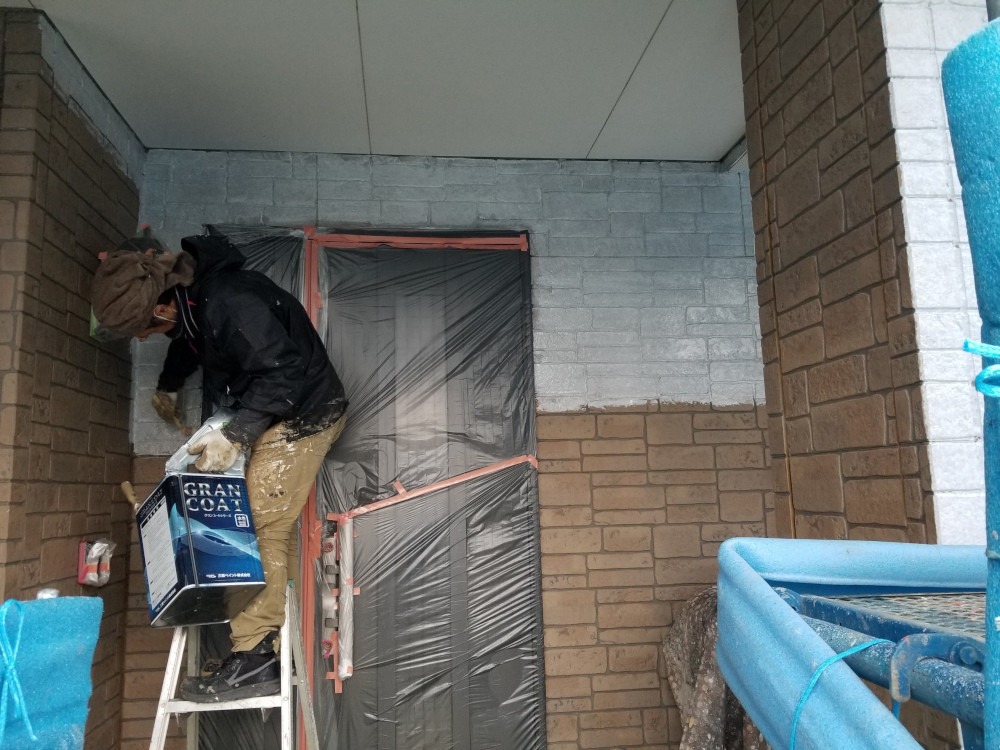 今回は築15年以上経過しているお住まいの初めての塗装工事でしたので、外壁の細かな傷みが出ている状態でした。塗装の上塗りの密着力を高める為に、下塗りの工程が大事になってきます。下塗り塗装工程が抜け漏れがないように点検を行いました。