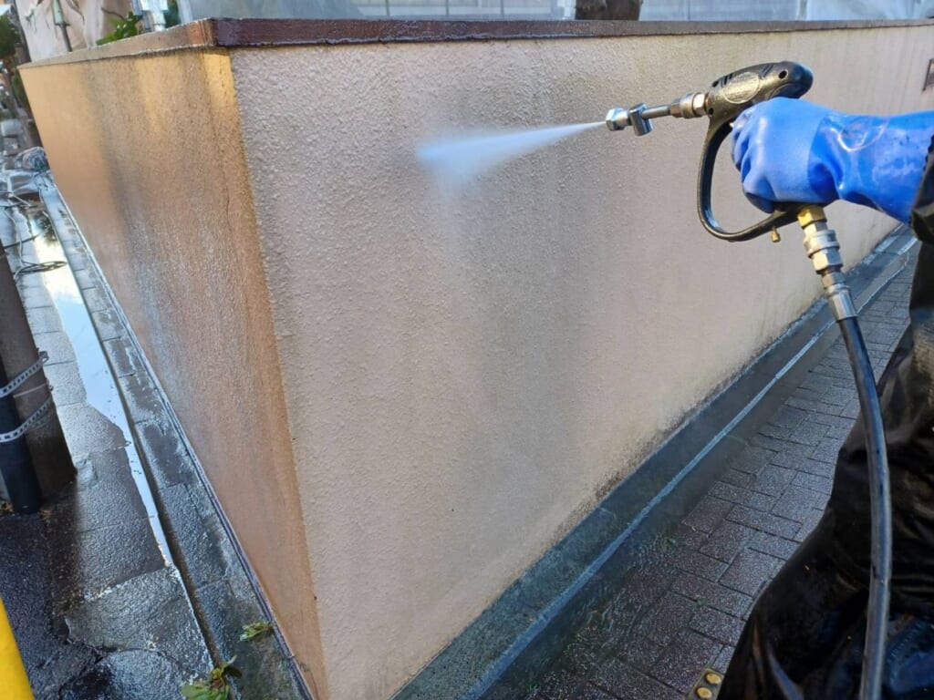 洗浄前は外壁が排気ガスでかなり汚れていました。下塗り塗装をする前にきちんと付着した塵やホコリを落とさないと、建材と塗料の密着が悪くなり剥離の原因となります。その為、できる限り高圧洗浄で汚れを丁寧に除去しました。