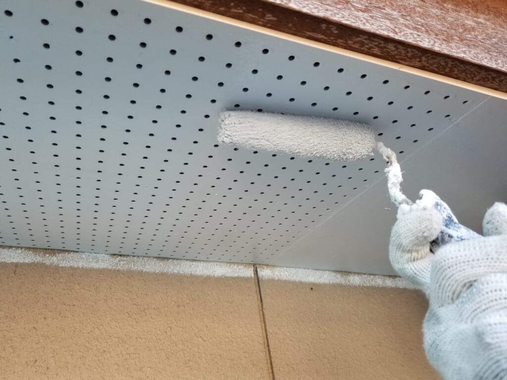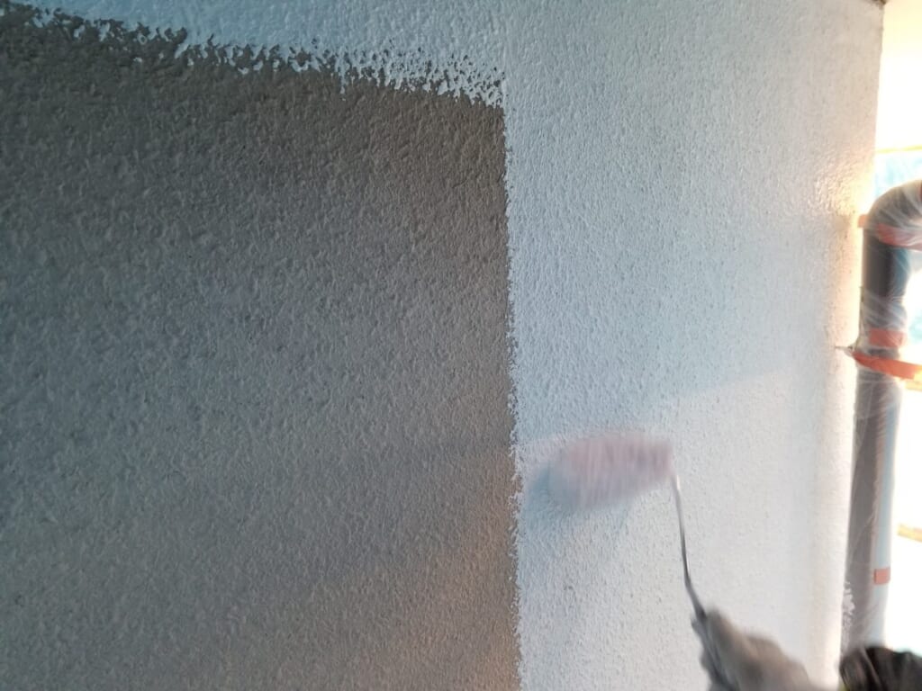 今回は築20年以上経過しているお住まいの初めての塗装工事でしたので、外壁の細かな傷みや亀裂が出ている状態でした。塗装の上塗りの密着力を高める為に、下塗りの工程が大事になってきます。下塗り塗装工程が抜け漏れがないように点検を行いました。