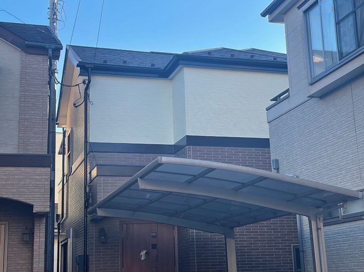 屋根の上塗りは塗りムラが出ないように塗膜の厚みを均一に保つこと、上塗りの膜厚がしっかりと付くようにすること、表面に石吹き塗装しているため凹凸の隙間に塗布することを意識しました。また、塗り残しなどがないように作業毎に確認作業も入念に行いました。屋根色も変わったのでお住まいの印象がかなり変わったと思います。