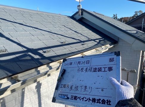 アスファルトシングル材の表面には石吹きの塗装しているため、一般的なシーラー系だと吸い込みが激しくなり、さらに油性系の塗料だと剥離する可能性があるのでアスファルトシングル材専用の下塗りを使用して上塗り材に影響が無いように塗りました。