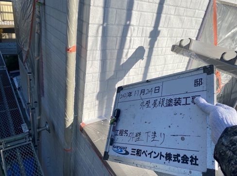 下塗り作業では細かい所までしっかりと塗り込みました。傷みがある箇所はクラックに下塗り塗料がしっかりと入り込むように、塗りムラや塗り残しが無いか確認しながら作業をしています。窓廻りなど塗料が入りにくい箇所は、刷毛を使い丁寧に塗りこみました。