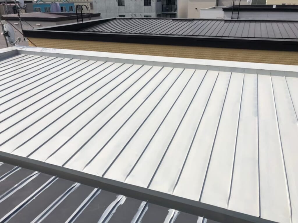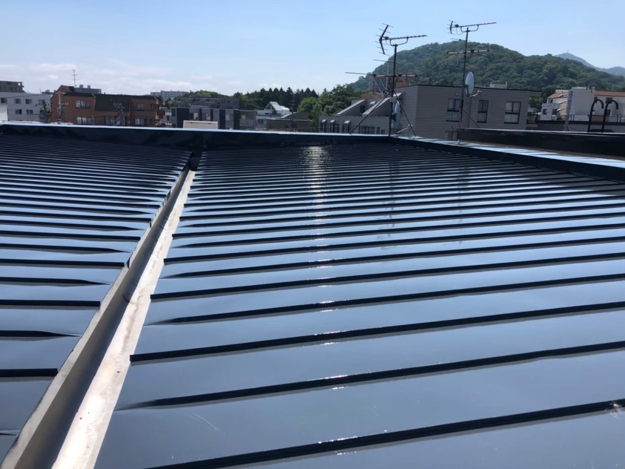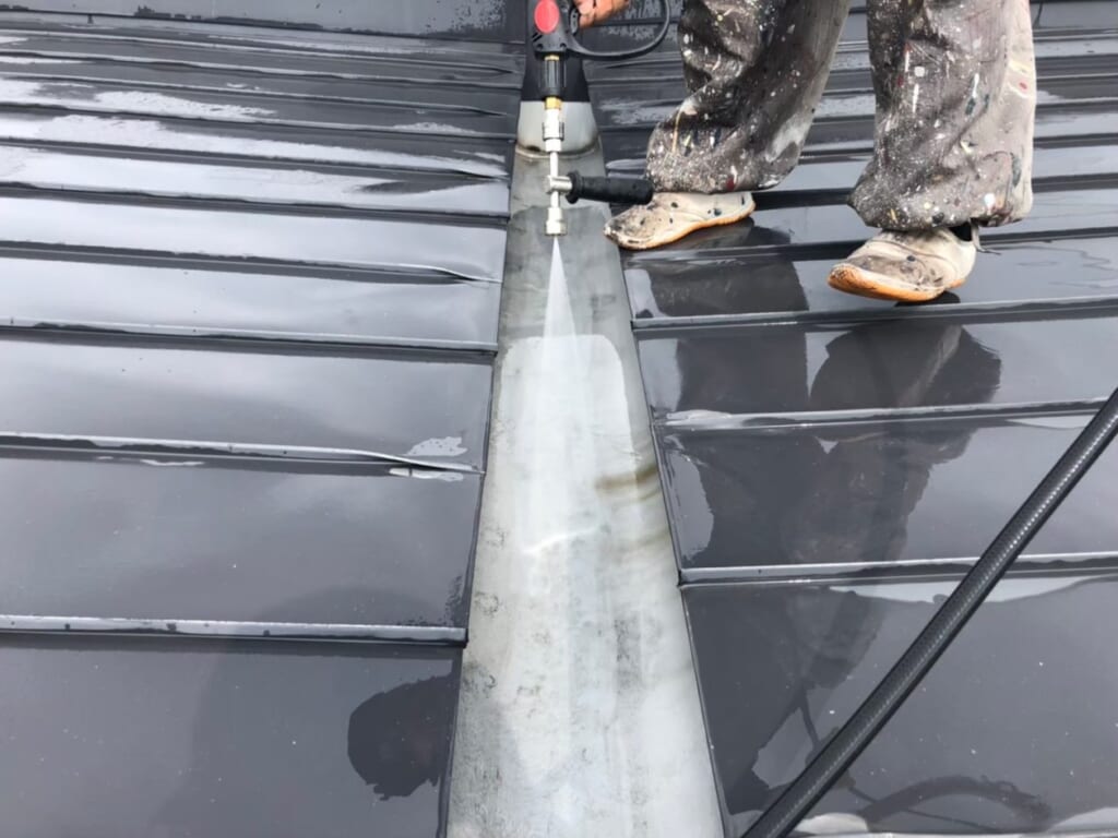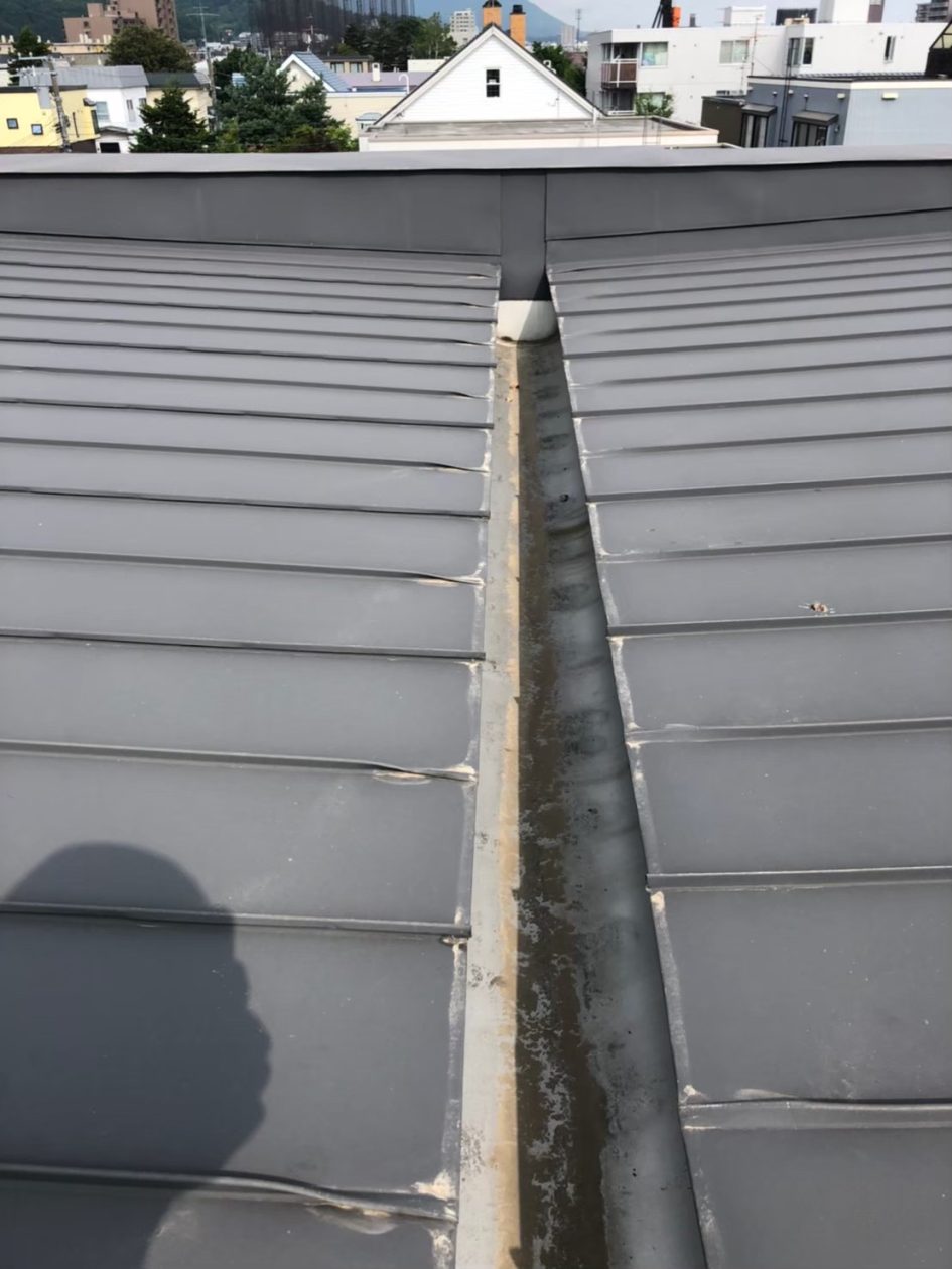 職人とタラップから屋根に登り傷み具合のチェックと対処方法を検討し、まず洗浄してからしっかりケレン掛け作業から始めました。そのあと下塗りを継ぎ目の奥の方まで入れてムラないように丁寧に塗るよう指示しました。そのあと無落雪ダクトのコーキングが劣化していたのでコーキング補修を行いました。