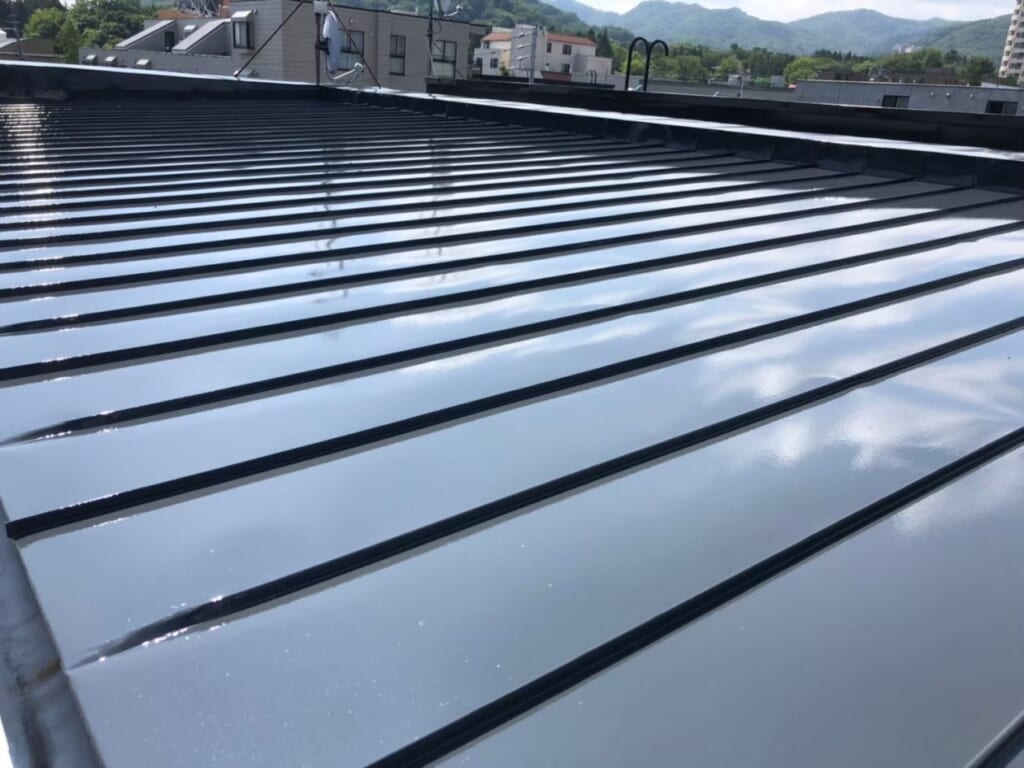 天気のいい日が続き上塗りを行うことでさらに艶と深みが出ていい仕上がりになりフッソという事もあり光沢も増しました。完工後も施主様には屋根に上がってもらえなかったので工程ごとの写真を見てもらいお褒めのお言葉をいただきました。