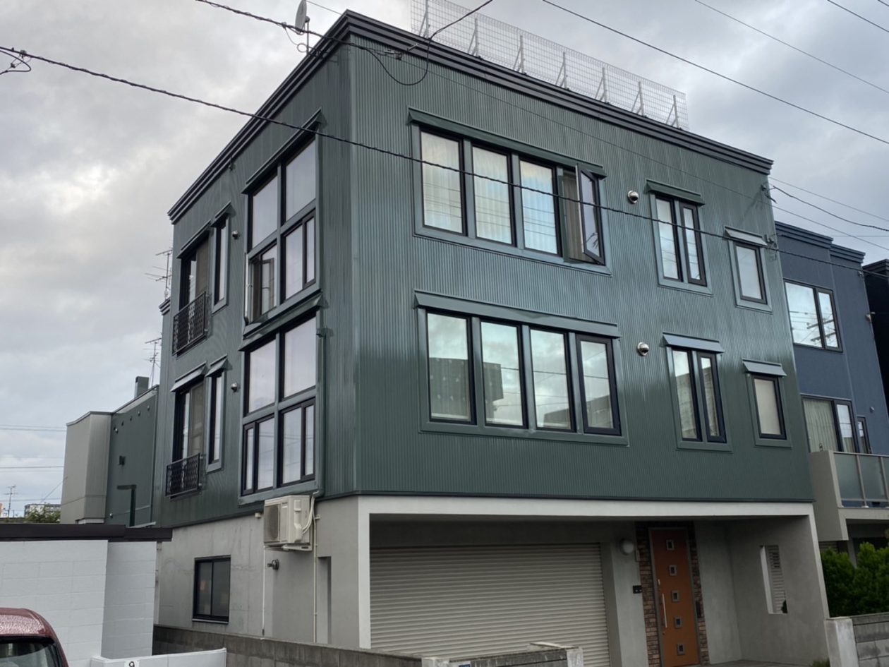 北海道では無落雪の陸屋根には冬期間、雪・氷が載り続けています。気温がプラスになると解けた雪・氷がスノーダクトに向かって滑り落ち、氷による引っかき傷で塗膜、板金に傷みが発生します。当住宅の屋根にも塗膜の剥離、キズから発生した錆があり、錆の再発を防ぐべく板金全体にケレン作業を施しました。