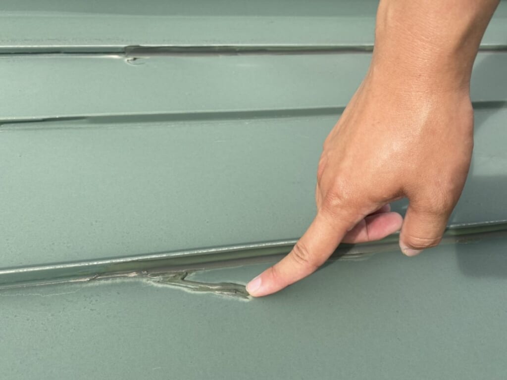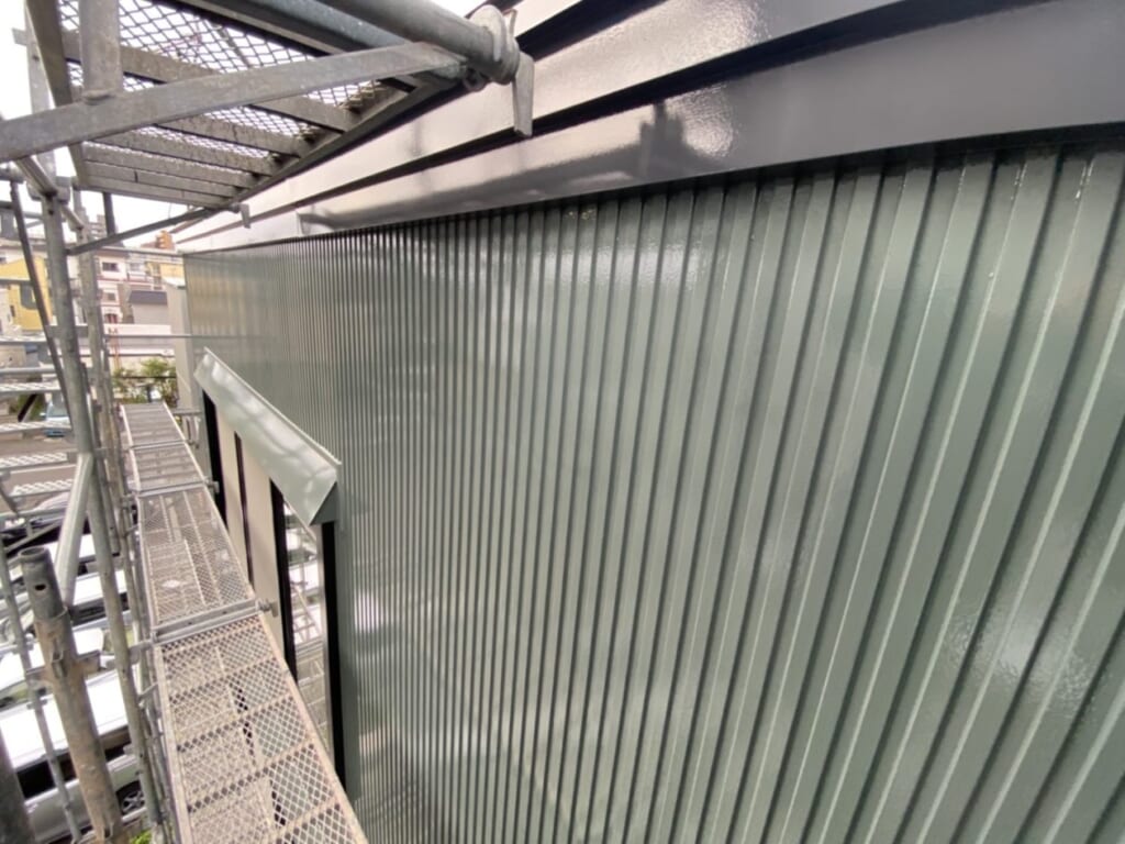 金属サイディングに親和性の高い下地材で下塗りを行いました。経年により傷んだ下地の建材再生、中塗り・上塗りの塗膜密着に高い効果が期待される特殊下地を当社では採用しています。手塗りで膜圧を均等に調整することでその後の仕上がりも綺麗になります。