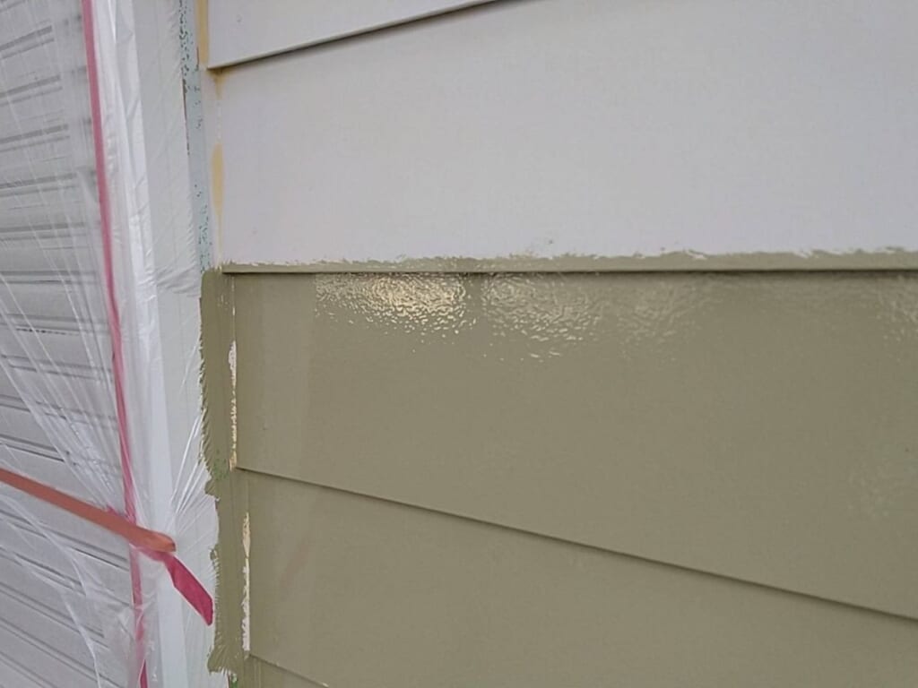 今回は築15年以上経過しているお住まいの初めての塗装工事でしたので、外壁の細かな傷みが出ている状態でした。塗装の上塗りの密着力を高める為に、下塗りの工程が大事になってきます。下塗り塗装工程が抜け漏れがないように点検を行いました。
