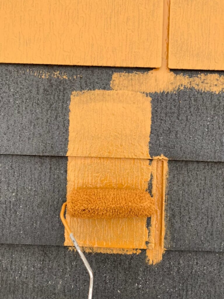 今回は鮮やかな黄色(オレンジ色)のイエローオーカーという色をお選び頂きましたが、位色の屋根に明るい塗料がなかなか乗らず、仕上げるのにとても苦労しました。最後は綺麗に仕上げることができ営業担当と職人でとても苦労した工程になります。