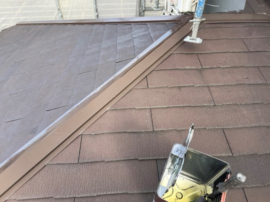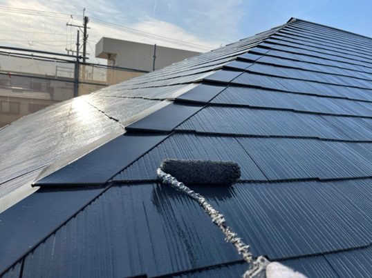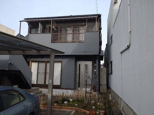 屋根の色は打合せで外壁色に合わせた落ち着いたカーボングレーに決まり、2箇所割れていた部分もありましたがコーキングと塗装での補修で対応し、携帯電話で工程の写真を見て頂いたり完工時の写真と説明で喜んで頂きました。