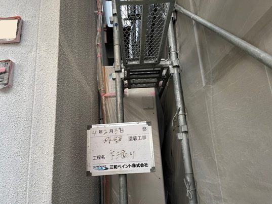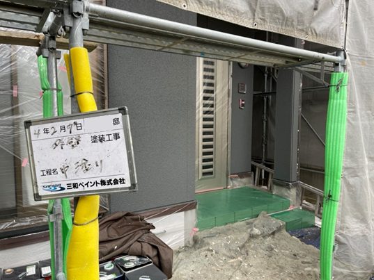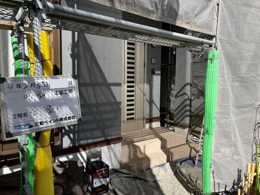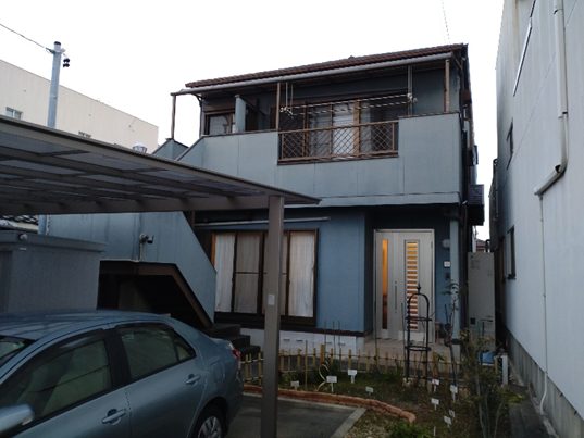 玄関柱や前面にヘアークラックがあり下地塗料をしっかりと塗布し、中塗り・上塗りで綺麗に仕上がりました。外壁色も打合せにより以前の薄い水色から落ち着いたグレーのSP-50にと決定し、仕上がりと共に満足して頂きました。