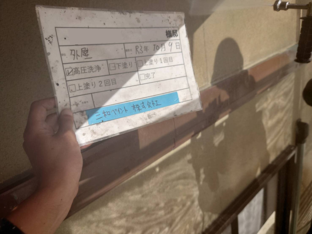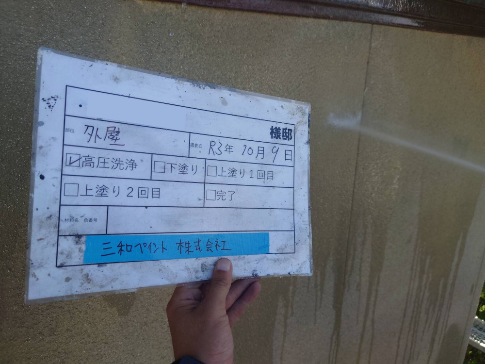 高圧のまま、洗浄すると既存のリシンの骨材が脱落してしまう部分が生じてしまう為、塗装の仕上げムラが出来て綺麗に仕上がらない。