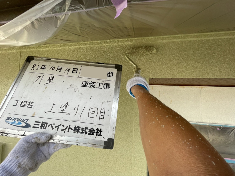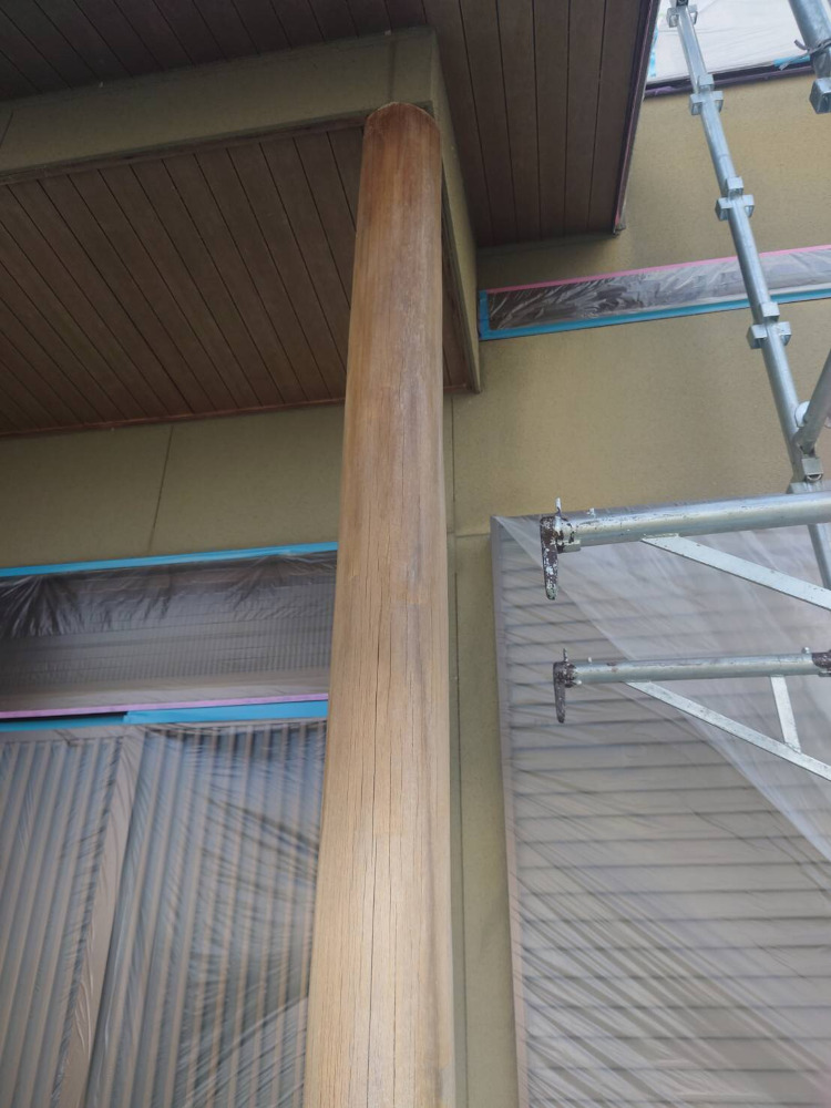 下屋根の瓦、銅の破風板、軒天井、玄関柱の木部に外壁用の塗料が付着すると素材にも影響がありため、付着した際は除去も困難であるためしっかり養生しました。