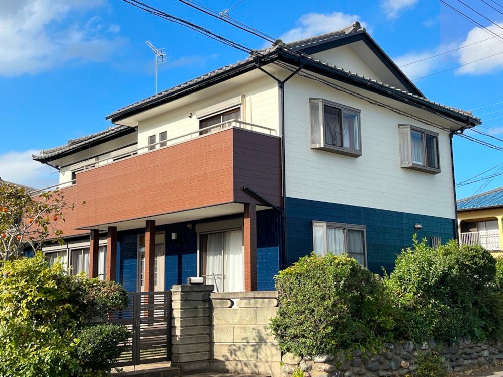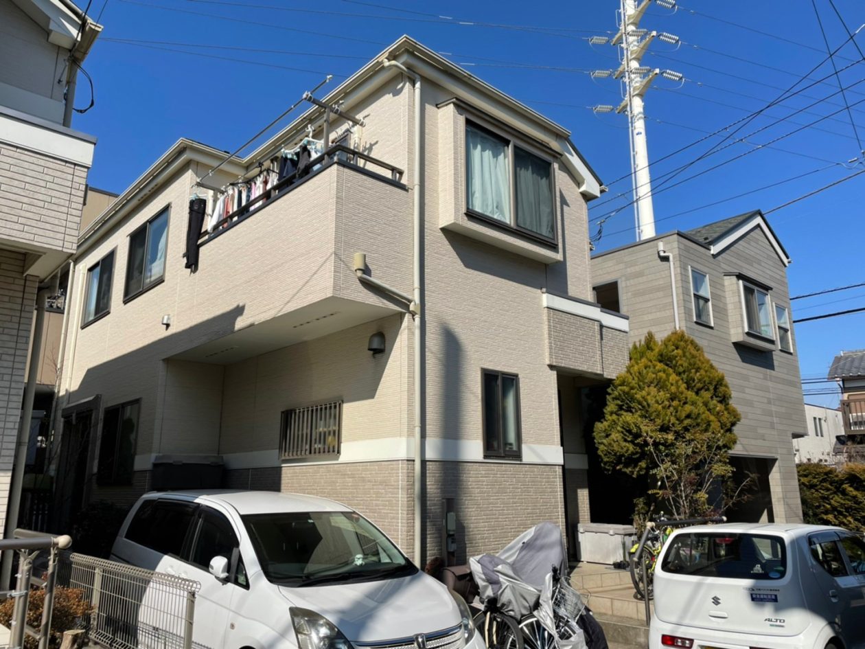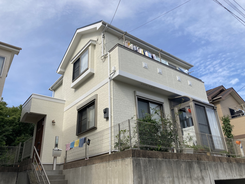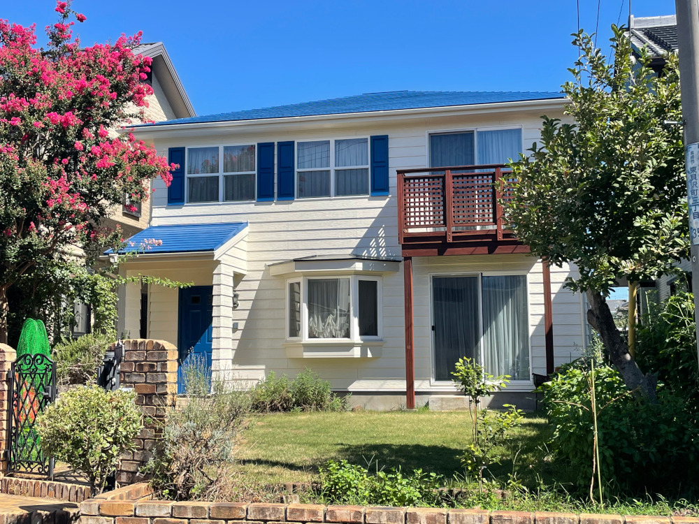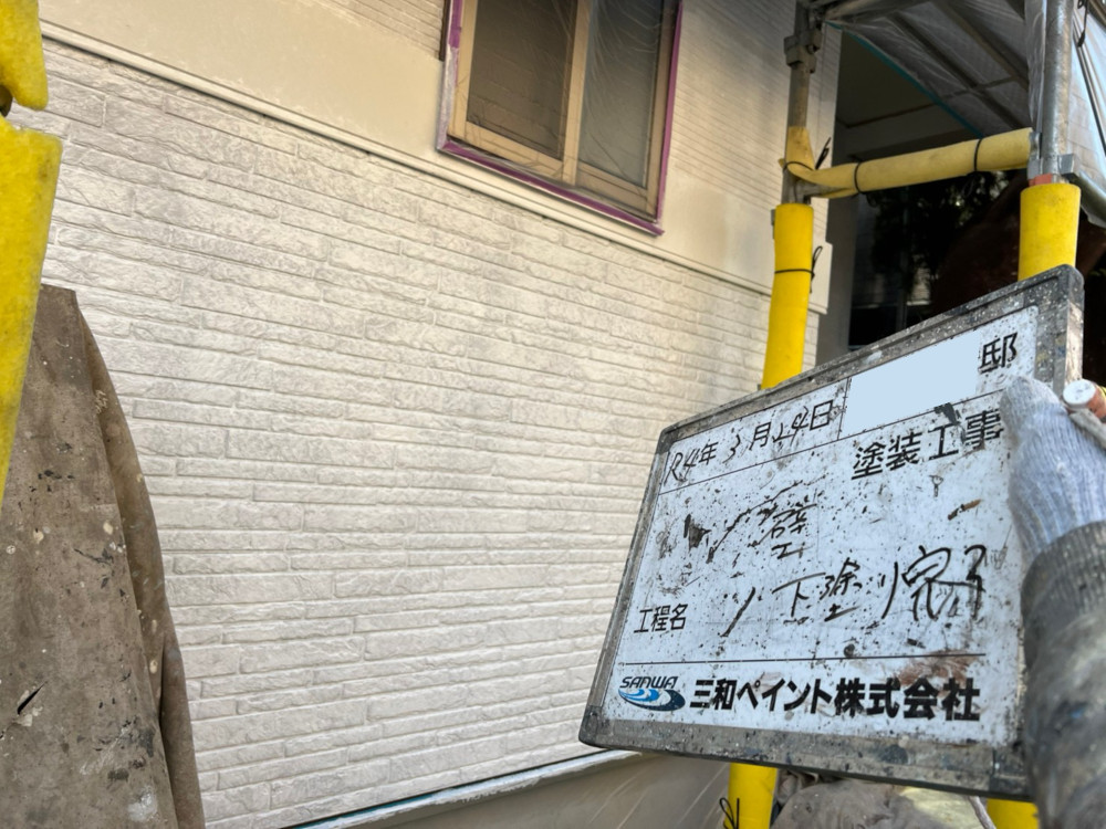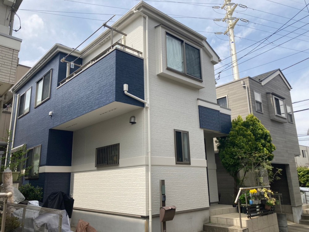 お客様のたっての希望で元来の上下ツートンから左右半面ずつの塗り替えに変更。境界部分をキレイにマスキングテープで見切り付けないといけないので、職人の丁寧さと腕の良さが試された行程でした。