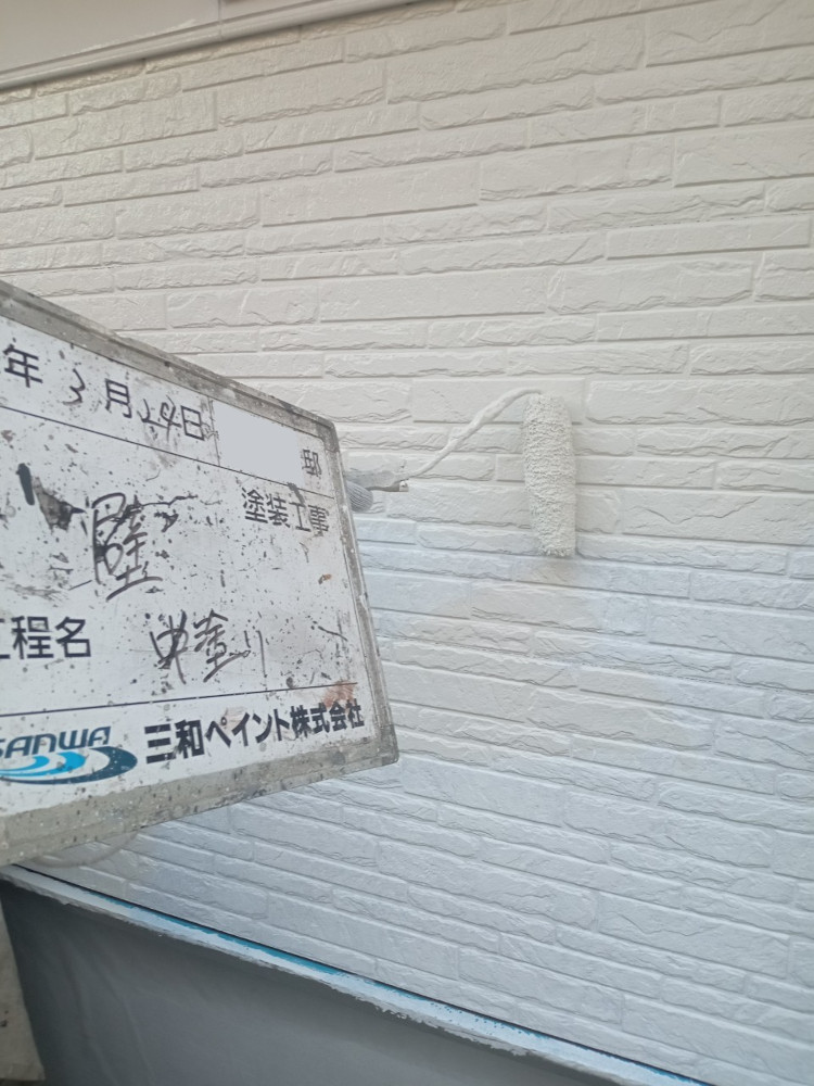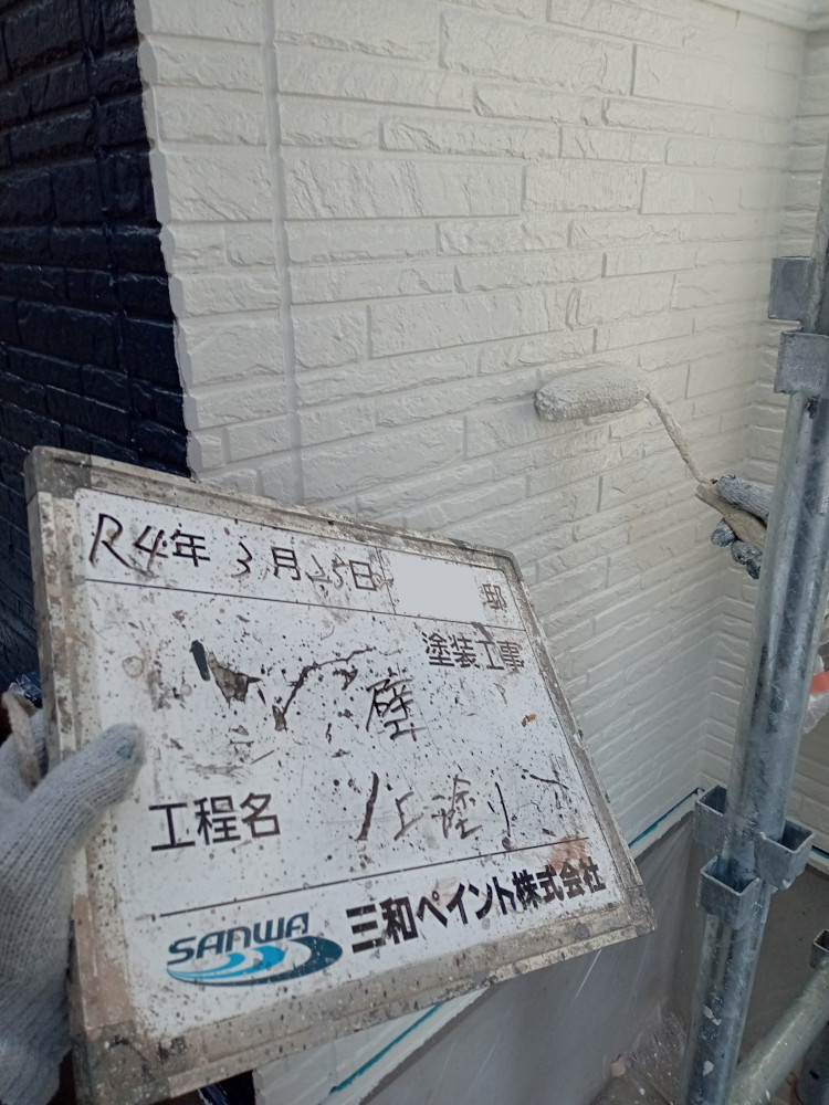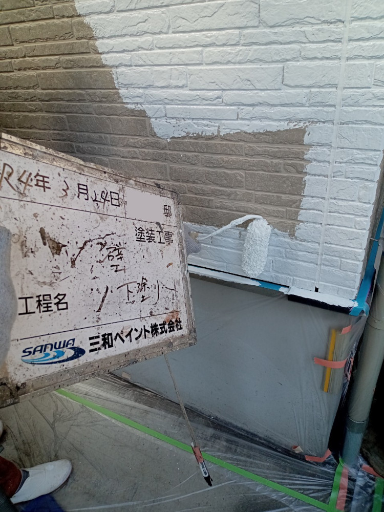 細かい亀裂や色あせ等、年数なりのお傷みが見受けられたので、建材にしっかり浸透するように念入りに作業を行いました。この下塗をしっかり入れることで中塗り・上塗りの効果を性能通り発揮することが出来ます。そして中塗りでお好みの色をつけていきます。