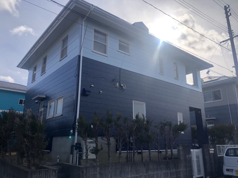 こちらのお住まいは元々ツートンカラーのお住まいだったので今回塗り替えでも下が紺色、上が薄い水色のツートンカラーを選ばれました。外壁と付帯の見切りをつけるのと同様、ツートンカラーの場合も色の境目がはっきり分かるように綺麗に見切りをつけてあげるとより仕上がりが綺麗になります。