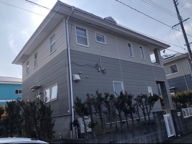 こちらのお住まいの付帯は、軒天井・雨樋・水切り・破風板と一般的なものばかりでした。普通軒天井以外は窓サッシの色に合わせて似たような色にするのがベストです。今回ですとサッシの色が白だったのでそれに合わせて白にすることで外壁の縁取りになり全体が締まって見えます。