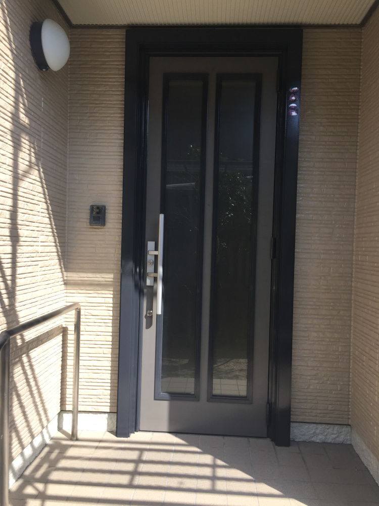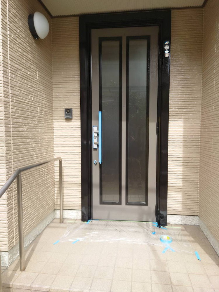 難付着素材の玄関ドアは難付着対応の下塗りを施し上塗りします。更に奥様からのご要望に応えるダークグレーとシャンパンゴールドの2トーンで仕上げました。