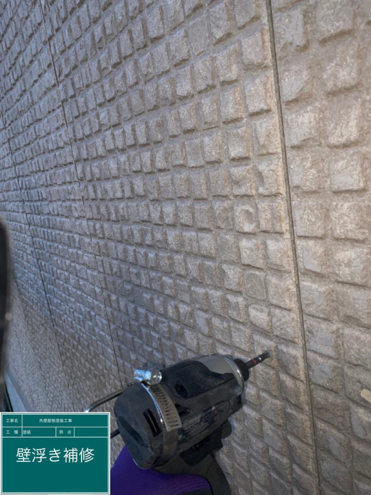 経年劣化により外壁が浮き上がっておりました。このまま塗装をしても外壁の浮きは元に戻らないため、ビス止めによる補修を行いました。ビス止めの作業においては細心の注意を払わなければ、外壁自体の割れが発生することもありますので、慎重に作業を進めました。