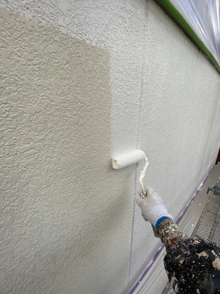 ALC自体に防水性はないため、現場での塗装によって防水機能を持たせています。ALCは蓄熱性の高い外壁材のため、透湿性の悪い弾性塗料を使用すると外と中の温度差により塗膜の膨張や剥がれが生じてしまう恐れがあります。傷みが酷い状態ならなおさらです。今回は浸透性・付着性に優れている微弾性塗料を使用しました。