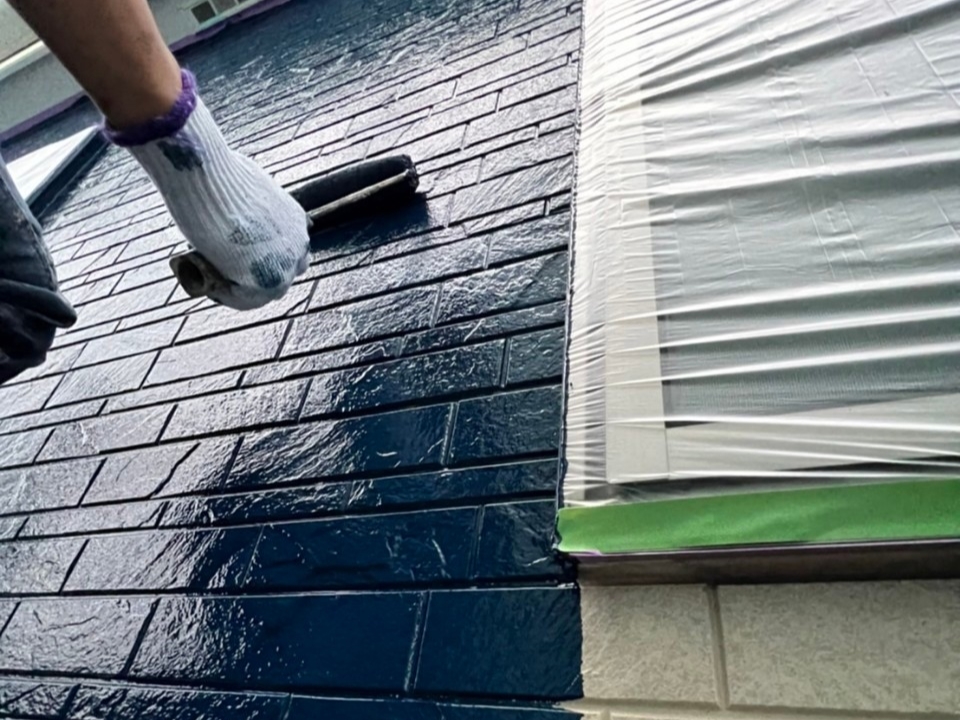 今回は初めての塗装工事お住まいでしたので、既存屋根材との密着も考えて材料の選定と状態を確認しながら作業工程を進めました。塗装の上塗りの密着力を高める為に、下塗りの工程が大事になってきます。下塗り塗装工程が抜け漏れがないように点検を行いました。