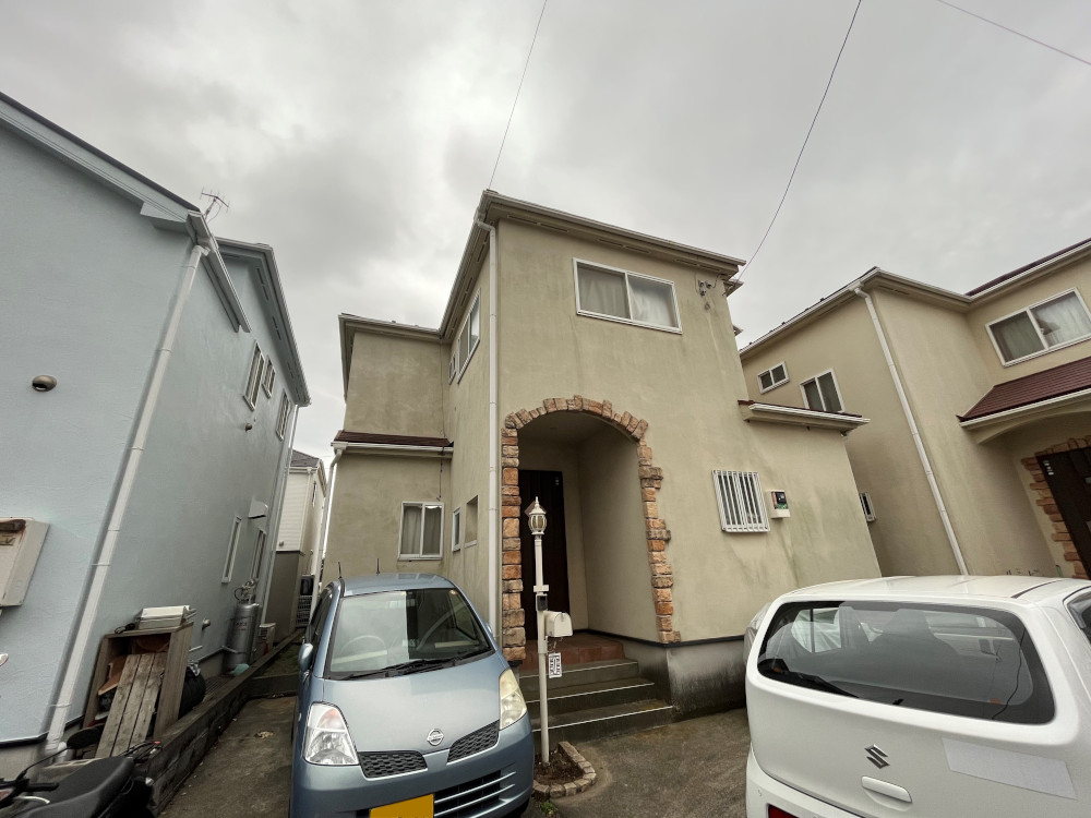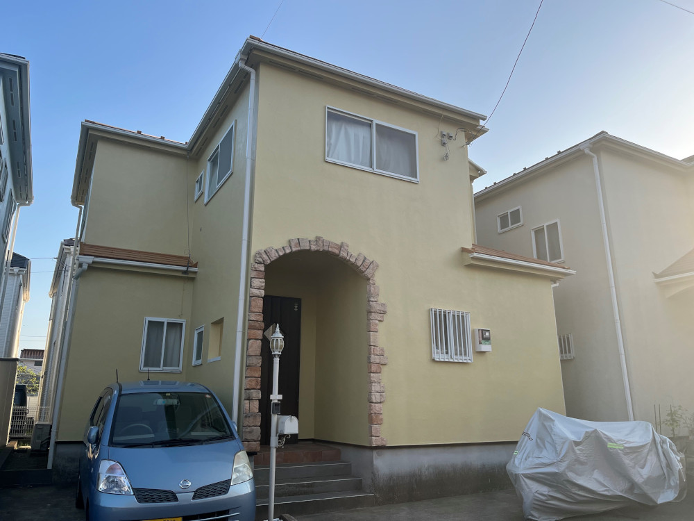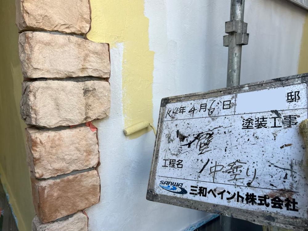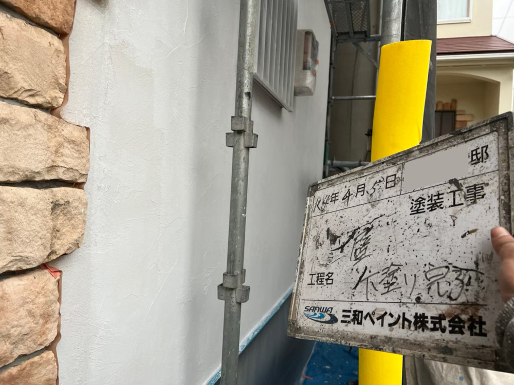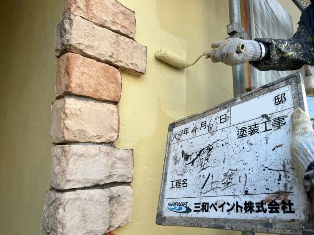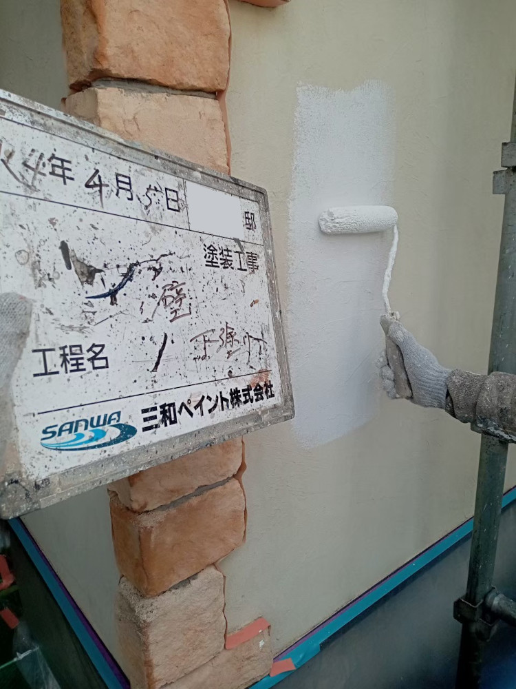 外壁の建材がモルタルでしたので、モルタル外壁に適した下塗り材を塗布しました。ヘアークラックと呼ばれる外壁の細かな亀裂まで密着するように、手塗りで押し塗り込んでいきます。一度下塗り塗料でお住まいが真っ白になります。