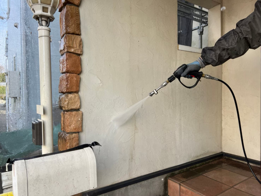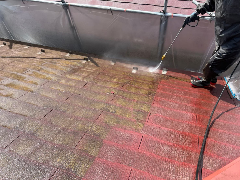 外壁や屋根には建ててからこれまでについた砂、ホコリ等の細かな汚れやコケ、カビ等が蓄積されています。何もせずそのまま塗料を塗ってしまうと塗料がうまく付着しなかったり、塗りムラができるなどの原因になってしまいます。しっかり洗い落として一度、表面を綺麗な状態にしてあげます。